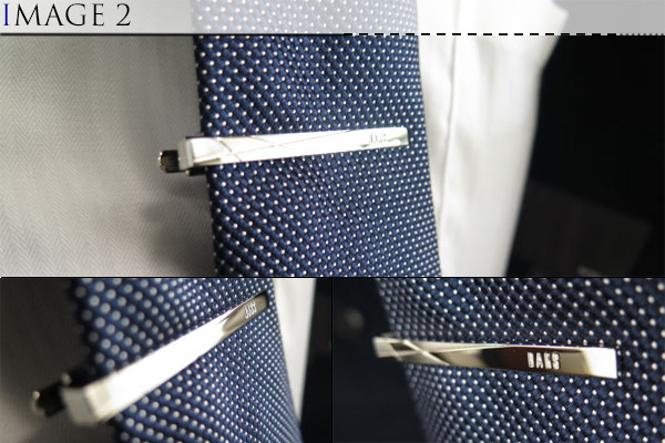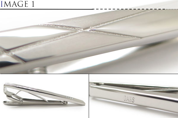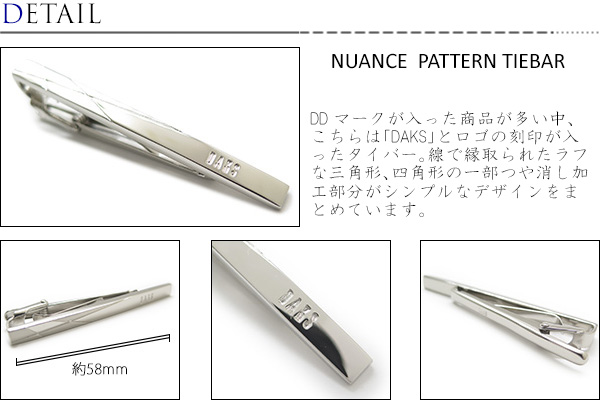 DDマークが入った商品が多い中、こちらは「DAKS」とロゴの刻印が入ったタイバー。線で縁取られたラフな三角形、四角形の一部つや消し加工部分がシンプルなデザインをまとめています。