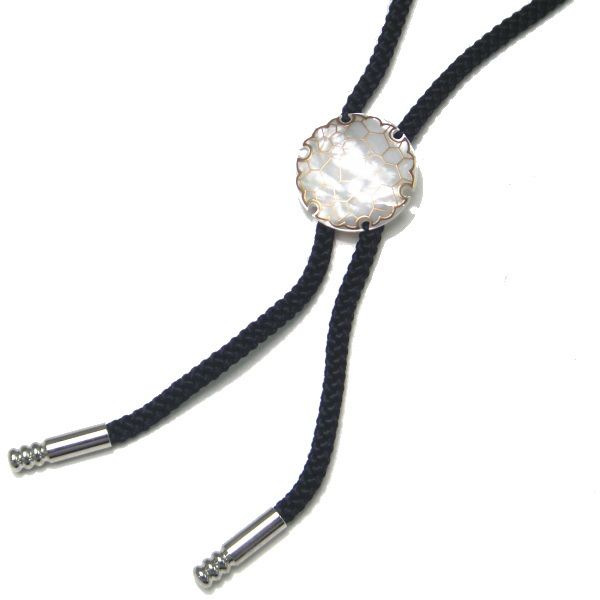 やわらかく独特な貝の輝きと金が見事に調和し、ドラマティックな雰囲気を醸し出す、美しいループタイ(ポーラー・タイ)です。