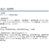 【栄養成分表示[3粒1215mgあたり]】熱量7.2kcal、たんぱく質0.34g、脂質0.52g、炭水化物0.28g、食塩相当量0.003g、リンゴポリフェノール75mg、総カテキン類(緑茶抽出物由来)48mg、赤ワインエキス末30mg(総ポリフェノール18%)、γ-リノレン酸35mg