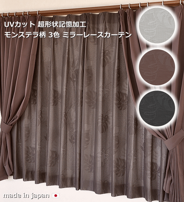 レースカーテン モンステラ柄 日本製 超形状記憶加工 ミラーレース UVカットモンステラ ハワイアン ボタニカル アジアン 葉柄 ブラック ホワイト ブラウン