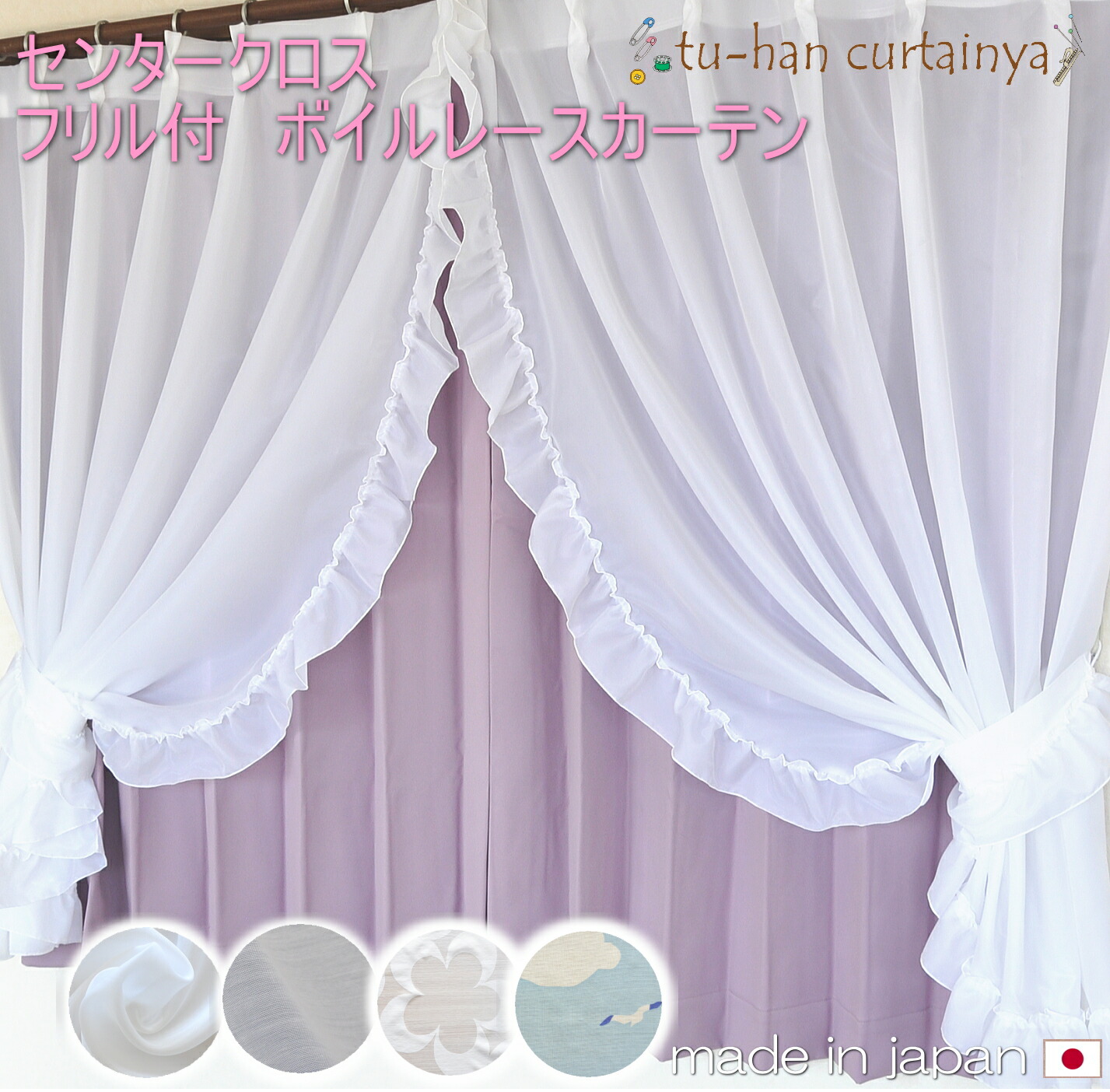 お姫様カーテン 日本製 センタークロス レースカーテン2枚組 フリル付ボイルレース 出窓カーテン 幅100cmイーボイル・サブレ・クラウド・カローラ