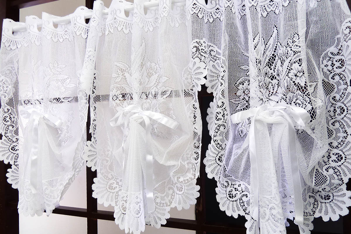 ◇ くじゃくが羽を広げたような丸みを帯びた3つのスワッグデザインと、それぞれのスワッグの中央部に取り付けられたサテンのリボンが特徴のピーコックスタイルのカフェカーテンです。