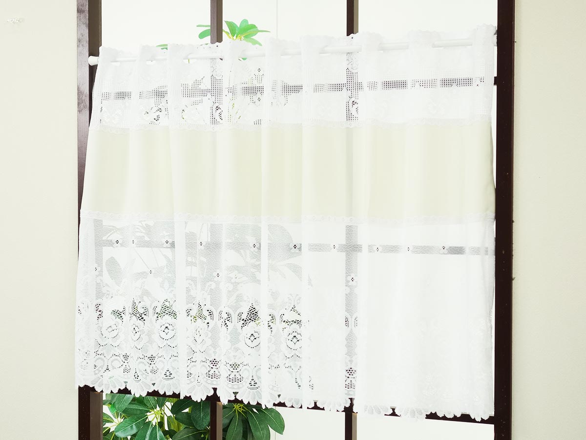 アイボリーの無地生地をキレイなホワイトレース生地でサンドウィッチしたカフェカーテン「アナトリア」