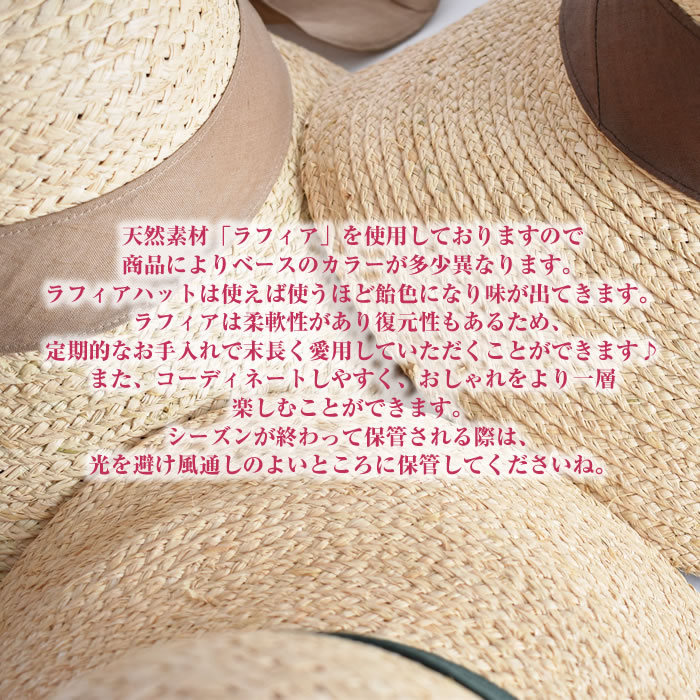| ナチュラルなラフィア素材が大人カジュアルやリゾートにもぴったりなツバ広の麦わらハットです。後ろに向かって長めのロングリボン付きで、エレガントで可愛さをプラス。バックカットでまとめ髪でも被りやすいから、暑い季節にも大人気☆ツバ広なので、しっかりと紫外線対策しながら夏のお洒落コーデが叶います。デイリー使いはもちろん海やプール、旅行やアウトドアなどのお出かけにも大活躍してくれます♪紫外線対策・日焼け対策はもちろん、コーディネートのアクセントにもオススメです♪ |
