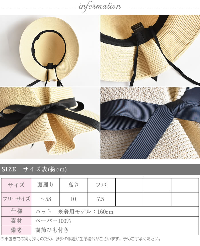 | ナチュラルなペーパー素材が大人カジュアルやリゾートにもぴったりなツバ広の麦わらハットです。後ろのタックデザイン&上品なグログランリボンがお洒落♪ツバ広なので、しっかりと紫外線対策しながら夏のお洒落コーデが叶います。デイリー使いはもちろん海やプール、旅行やアウトドアなどのお出かけにも大活躍してくれます♪紫外線対策・日焼け対策はもちろん、コーディネートのアクセントにもオススメです♪ブラックリボンが顔周りをスッキリと見せてくれて小顔効果も抜群です。 |