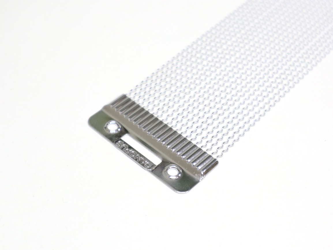 Canopus Vintage Snare Wire 12インチ用 クロームメッキスナッピー CPSL-12NPカノウプスの大人気アクセサリー、ヴィンテージスネアワイヤーです。ドラムサウンドの中で、もっとも大きな比重を占めているスネアドラム。カノウプスは、そのスネアサウンドを決定づけているのはスネアワイヤーであるという点に改めて着目しました。ただの消耗品という扱いされがちなスネアワイヤーが、カノウプスのこだわり抜いたディティールにより、スネアドラムのサウンド、演奏感に驚異的な変化をもたらすアイテムとなりました。カノウプスヴィンテージスネアワイヤーには、スネアワイヤーのヴィンテージと言える60年代スリンガーランドのスナッピーを正確に成分分析し、同一素材を採用。量産が非常に難しい線径0.5mm、線外径1.35mm、ピッチ3.4mmのオリジナル形状までも忠実に再現しました。エンドプレートの厚さは、最も繊細、かつ、ワイヤーを固定するに足る厚さ0.5mmの物を使用。この薄さにより発生すると考えられた、スネアストリング、テープの切れやすさは、それぞれを通す穴に折り返しを付けることで解決しました。更に、各社がスナッピーの吸い付きを良くするためにエンドプレートに施しているスネアストリング、テープのための溝は、逆にスネアサイド中心へのスナッピーの吸い付きを妨げていると結論付け、これらは採用しませんでした。これによりレスポンスの良さが際立ち、繊細なタッチにも反応することができる大きな要因となっています。このようにして成分分析、エンドプレートの厚さ、形状等の実験、量産問題の解決に数年の歳月を費やして完成したヴィンテージスネアワイヤーは、際立つ立ち上がりと音の深み、そして歯切れの良さを実現させました。カノウプスヴィンテージスネアワイヤーが、どれほどまでにスネアドラムのサウンドに劇的な変化をもたらすかは、ジャズ界の若き天才ビル・ステュワートが当社に立ち寄った際に、製作途上のプロトタイプを、「どうしても欲しい」と持ち帰ったことや、カノウプスの様々なエンドーサーから寄せられる賛辞などからも証明されています。NP(クロームメッキ仕上げ):耳障りな高倍音をカットしつつ、メッキに含まれる倍音成分が作用したふくよかなサウンドが特徴。メタルシェルスネアと好相性で、よりきらめきのあるサウンドに。ウッドシェルスネアに装着すると、メタルシェルスネアのような華やかさが感じられます。