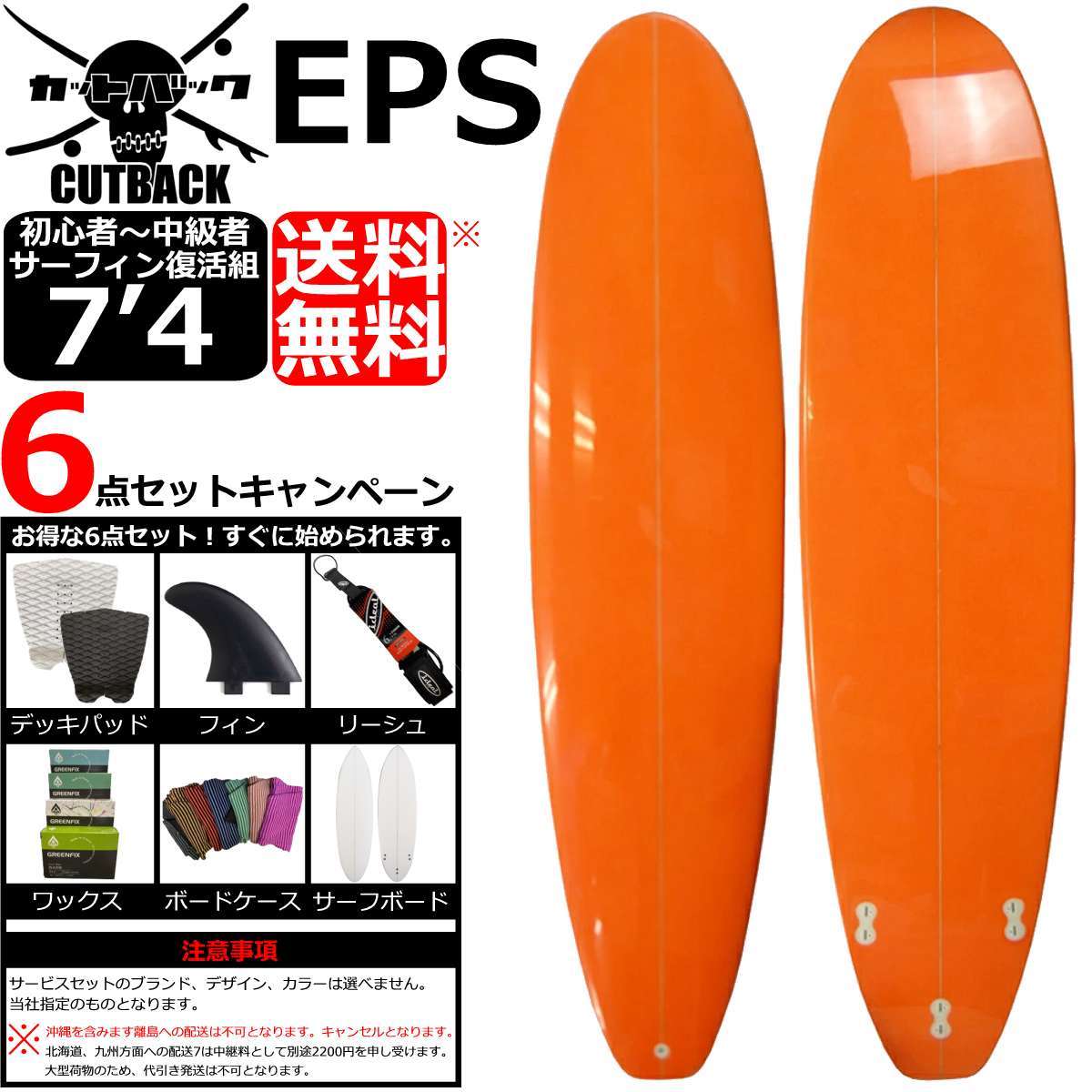 | このサーフボードのサイズ・データ | 日本の波に最適な1本!加速性も操作性も抜群! 材料となるブランクス〜ファイバークロス〜レジンもクオリティーそして、仕上がりも厳しいチェックをしているのでご安心ください。 長さ 7.4(224cm) 幅 21 1/4(53.97cm) 厚み 2 5/8(6.68cm) 容量 47.96L フィン 3プラグ・ロッカー 抑え目・レイル ミディアム・テール スカッシュ・ボトム シングルコンケイブ・3フィン標準装備!フィンはFCSカップ対応になっておりますので市販のFCSフィンもご使用いただけます。 |