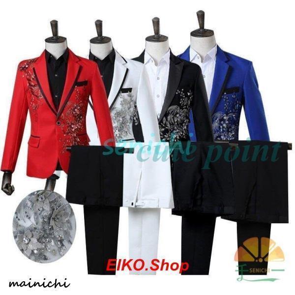 メンズカラースーツス立体3D花模様舞台ステージ衣装ダンス演出服スパンコールスーツ上下セット付結婚式パーティイベント年会タキシード礼服