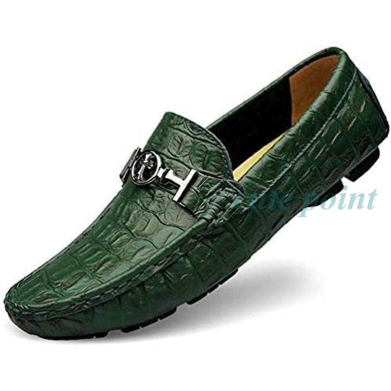 ゴム製のクロコダイル型押しが目を引く、スタイリッシュなデザインのドライビングシューズです。