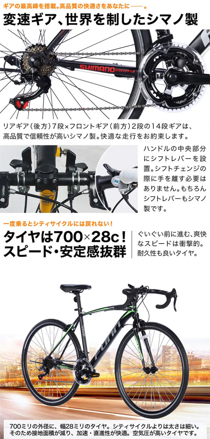 21テクノロジー 27インチ GT100S マットブラック/グリーン 自転車 ロードバイク 700×28c シマノ製14段変速