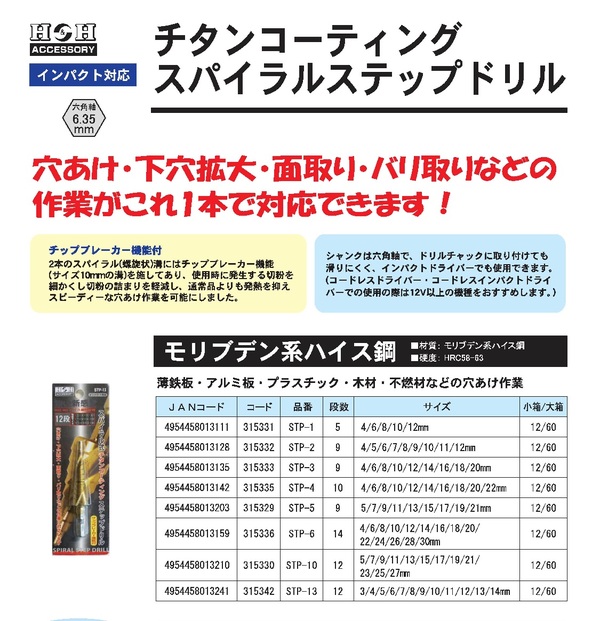 【商品名】 (業務用5個セット) H&H スパイラルステップドリル/先端工具 【STP-3 9段】 4〜20mmサイズ 〔DIY用品/大工道具〕 【ジャンル・特徴】 穴あけ・下穴拡大・面取り・バリ取りがこれ一本で!ドリル刃 [ STP‐3 ]