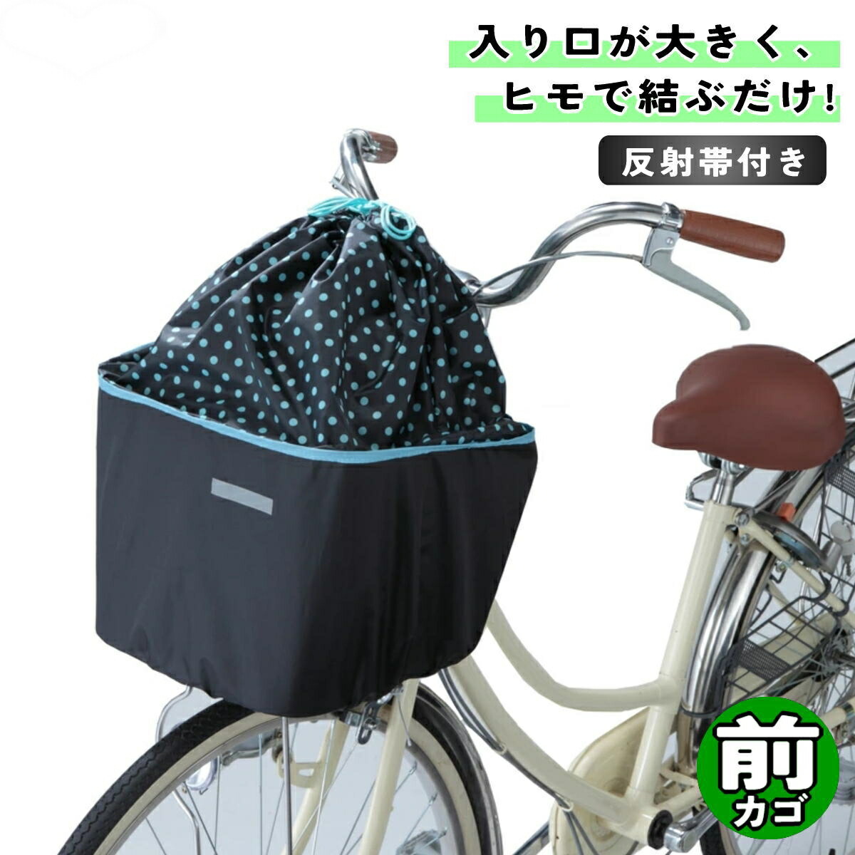 | 商品特徴 | 巾着タイプ前カゴカバー 大切な荷物を雨やひったくりから守ります。 ひもでむすぶだけ入り口が大きく荷物をラクラク収納!