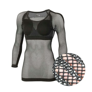■疎水性に優れ、熱伝導率の低いポリプロピレンをベースに、かさ高メッシュで編み上げることで肌面の汗を素早く吸収し、上位のベースレイヤーに拡散します。