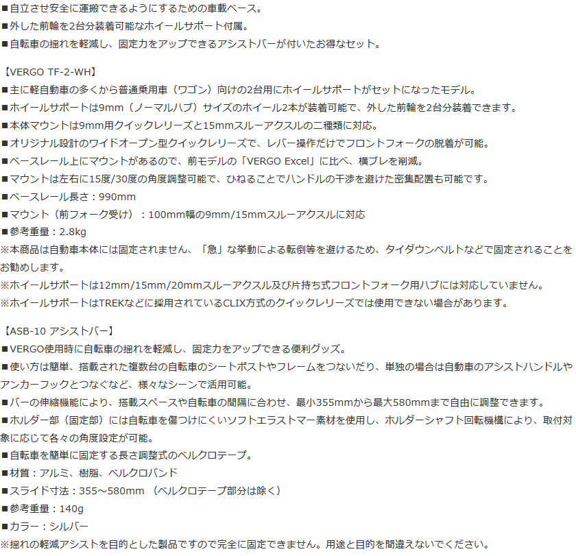 (特セール)(送料無料対象外)ミノウラ(MINOURA) VERGO(バーゴ)TF-2-WH 2台用 ホイールサポート付+ASB-10 アシストバー セット 車内積載用サイクルキャリア