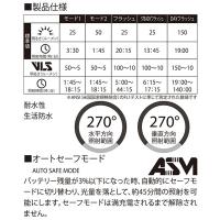 | 仕様 | バッテリーインジケータ搭載 VLS明るさ調整機能(※ルーメン調整機能)搭載 モードメモリー(※再起動時に終了時のモードで起動) オートセーフモード(※バッテリー残量低下時に光量を落とし照射時間を確保) トータルアングル:270度 |