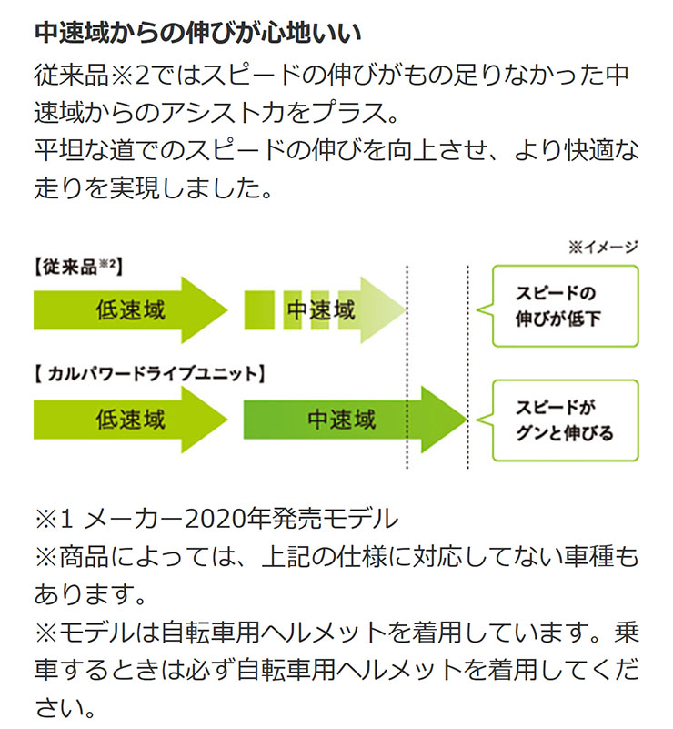 ※1走行条件:環境温度は20±5℃、無風の状態、バッテリーは新品、バッテリーライトは消灯状態、車載重量(乗員と荷物の合計)は65kg、路面は乾燥した平滑な路面、タイヤ空気圧は標準空気圧。