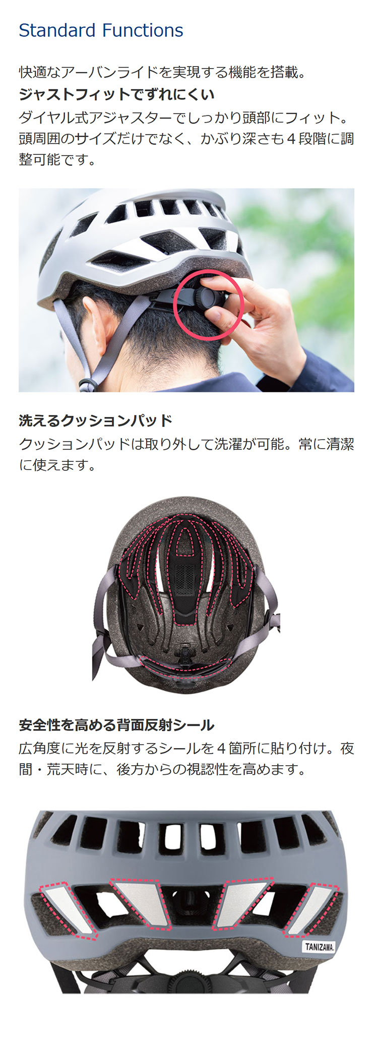 ヘルメット内の熱を自然と後方へ排出する設計で、快適なかぶり心地を実現。前面に6箇所配置した通気孔と、ヘルメット内部につがった溝が、こもりがちな頭部の熱を速やかに排出します。