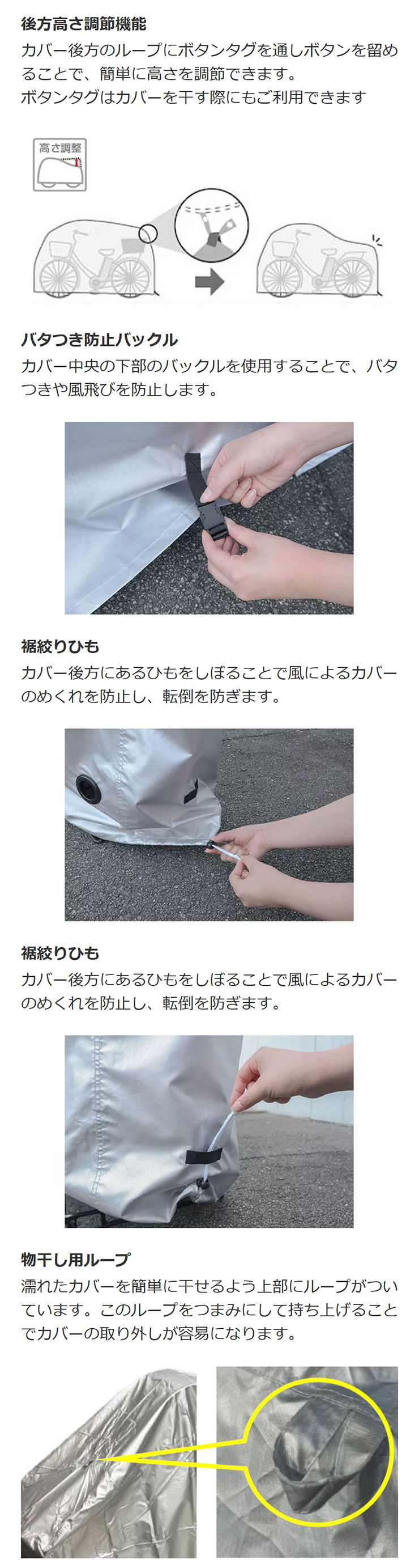 風飛び防止:後方をヒモで絞るめくれ防止機能