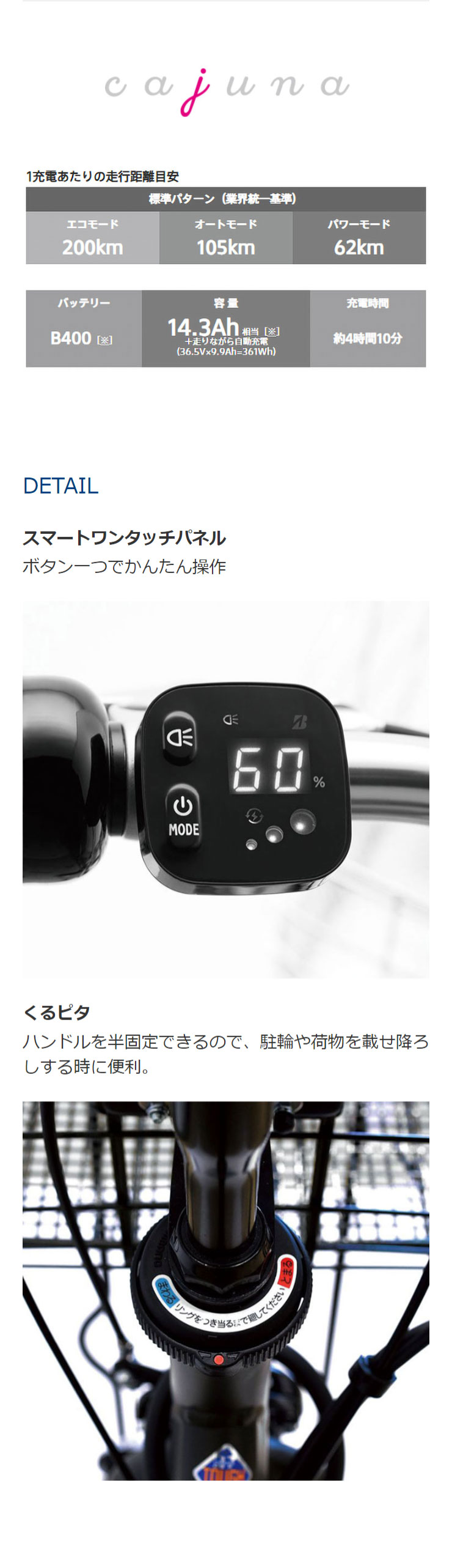 | 1充電あたりの走行距離の目安(標準パターン・バッテリー新品時) | エコモード:200km オートモード:105km パワーモード:62km |
