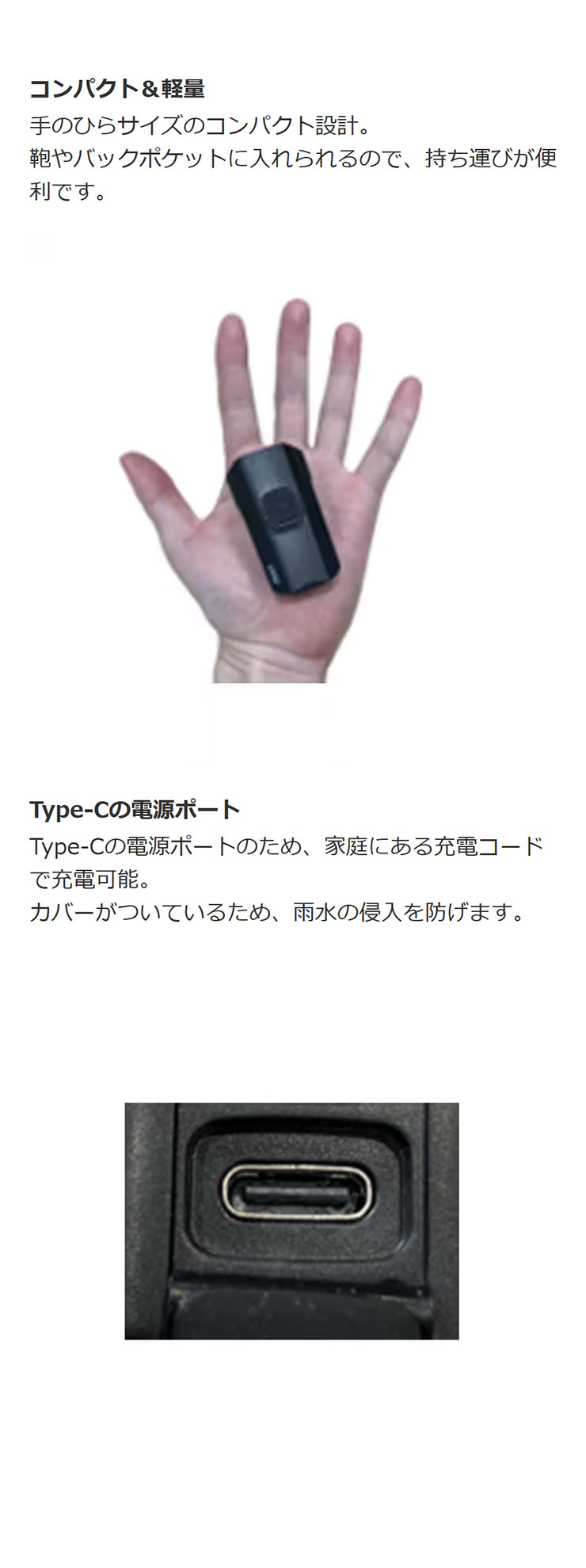 | 使用方法 | ・電源ON:1秒長押し ・電源OFF:1秒長押し ・モード変更:電源ボタンをクリック ・バッテリー残量表示: 100〜11%…ブルー点灯 10%〜…レッド点滅 ・モードメモリー機能:再起動時に前回終了時のモードで起動します。 ・電源ライト:ブルー…ハイモード グリーン…ローモード |
