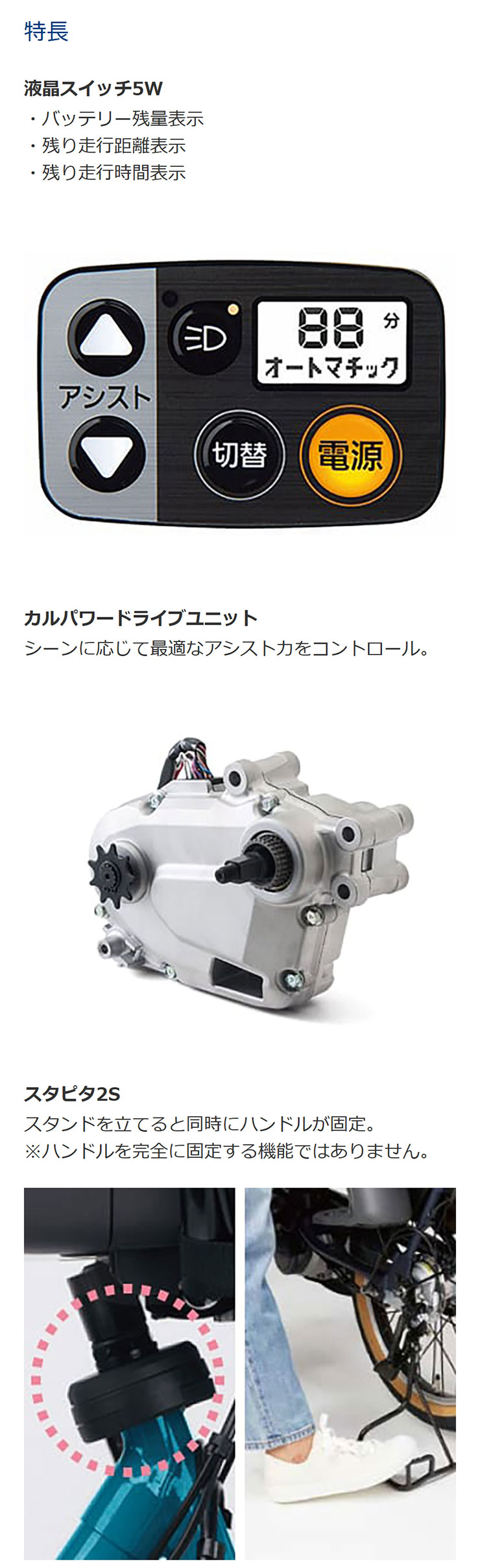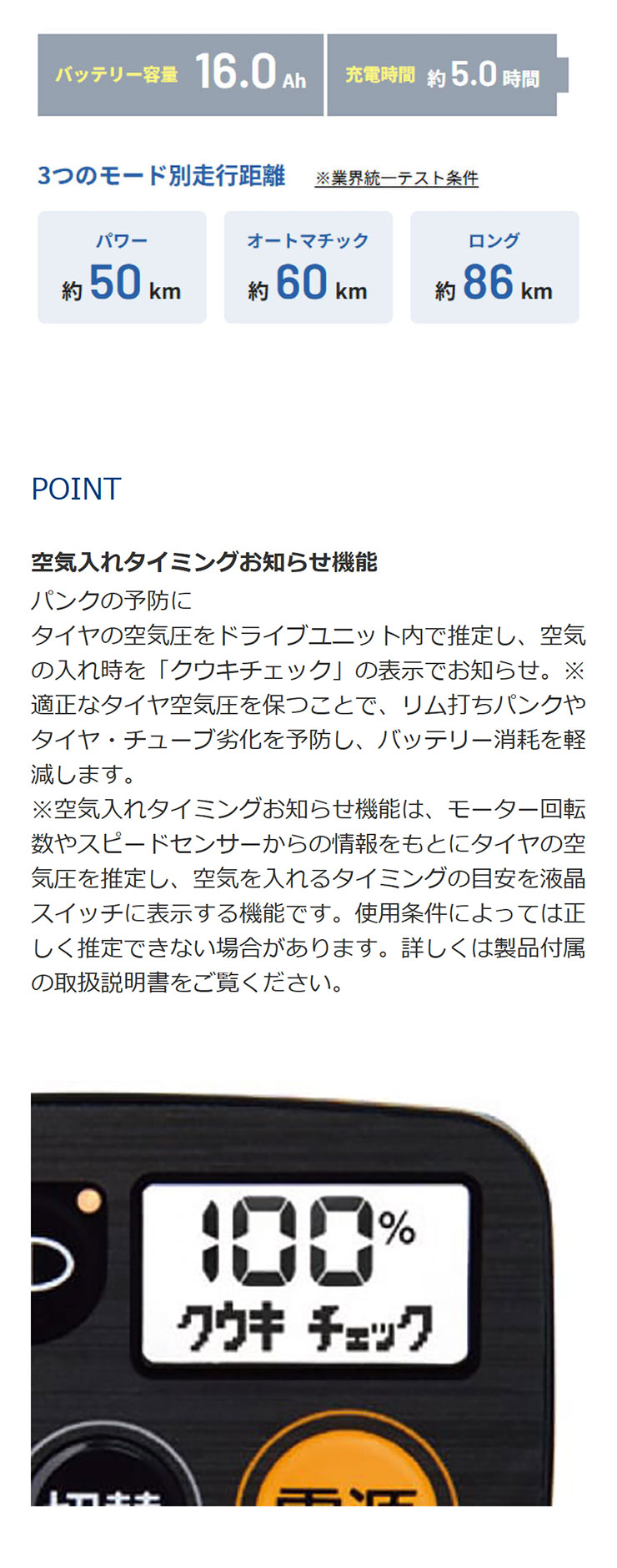| 充電1回の走行距離(標準パターン) | 約50km※1(アシストモード:「パワー」使用時) |