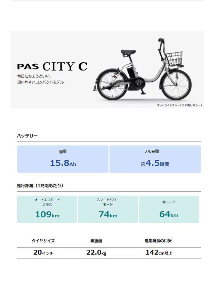 | 一充電走行距離?(注3) | 強モード:64km スマートパワーモード:74km オートエコモード:109km |