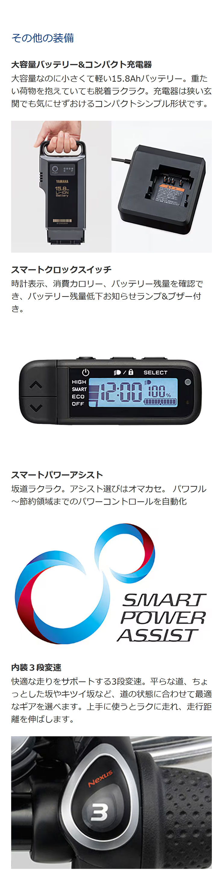 道路交通法の範囲内で快適さを最大限に広げるための、ヤマハのアシスト制御機構「Shift Position Electric Control」 の略です。