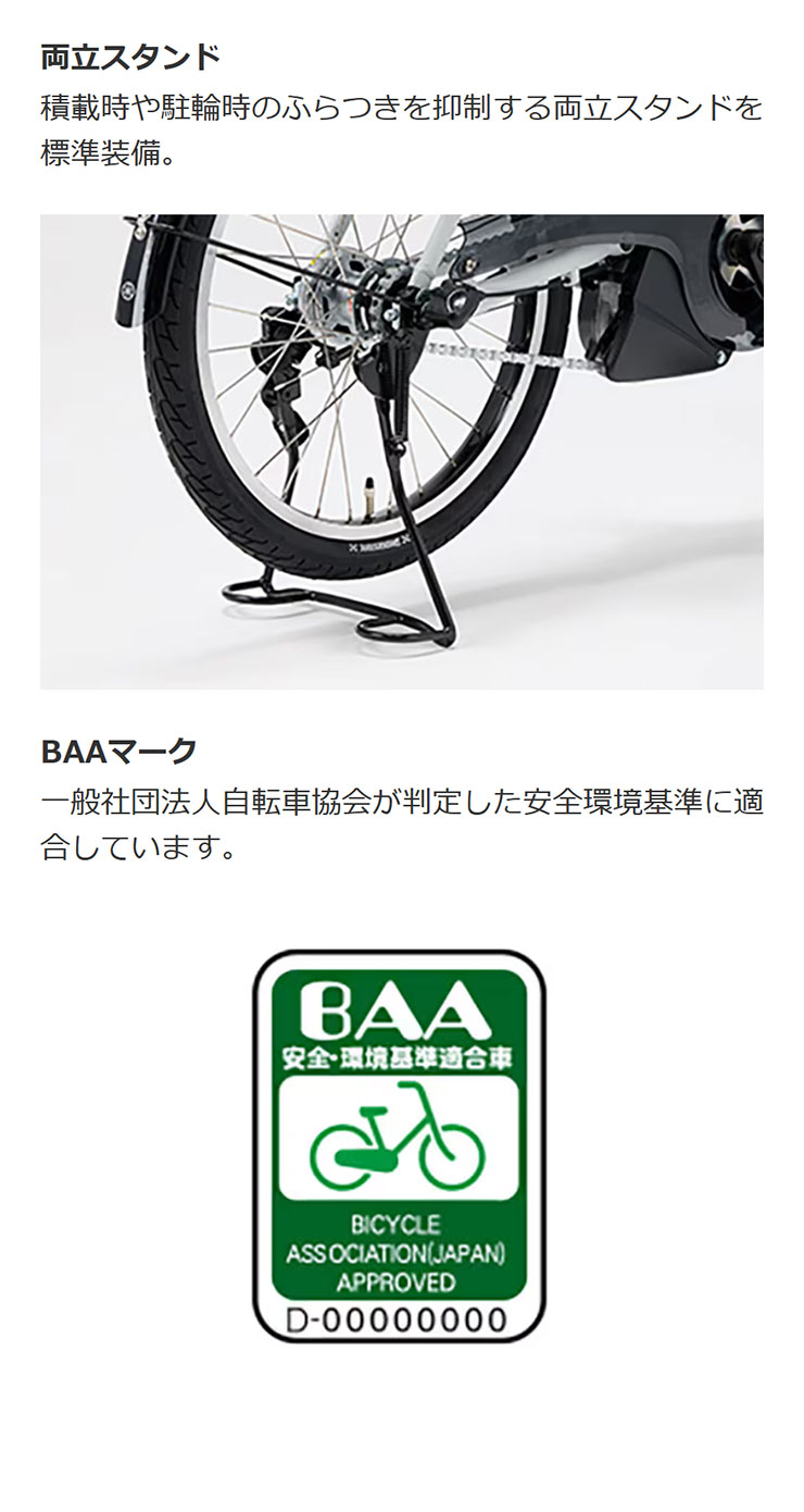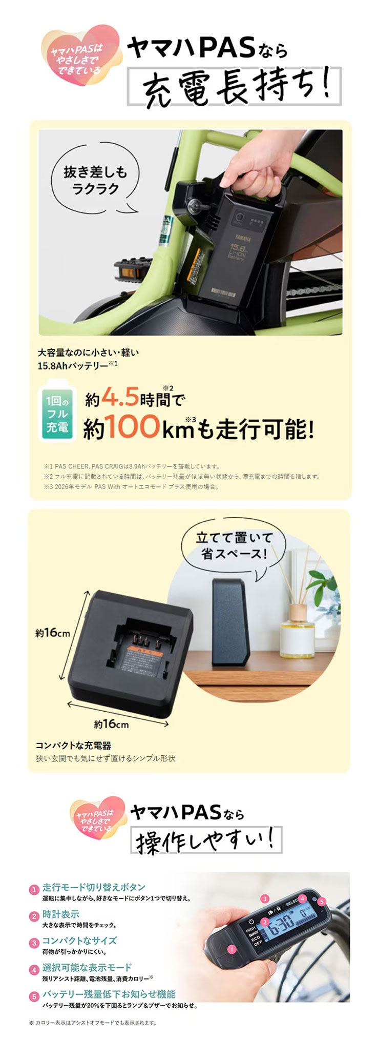 (注3) PASの走行できる距離は走る場所や走り方によって変わります。1充電あたりの走行距離は、車種によって異なるほか、道路状況、走行モード、走り方、気温、車載重量などによって変わります。なお、表記されている走行距離は標準パターンで測定した値であり、1充電あたりの走行距離を保証するものではありません。目安としてご活用ください。 *バッテリー新品、常温15〜25℃、車載重量(乗員および荷物を合計した重量)65kg、平滑乾燥路面、無風、無灯火状態、製造業者指定のタイヤ空気圧で、平坦路(1km)、勾配4度の上り坂(1km)を含む全長4kmの標準走行路を設定し、平坦路「変速ギア・3」15km/h、上り坂「変速ギア・2」10km/h、下り坂「変速ギア・3」20km/hで走行し、1kmごとに一旦停止を行ったときのテストデータ。