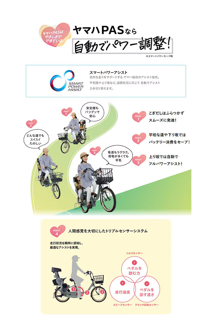 車速センサーが読み取った走行速度と、ペダルを踏む力から走行状態を推測し、各シフト位置ごとに最適なアシスト力で快適な乗り心地を提供するシステムです。