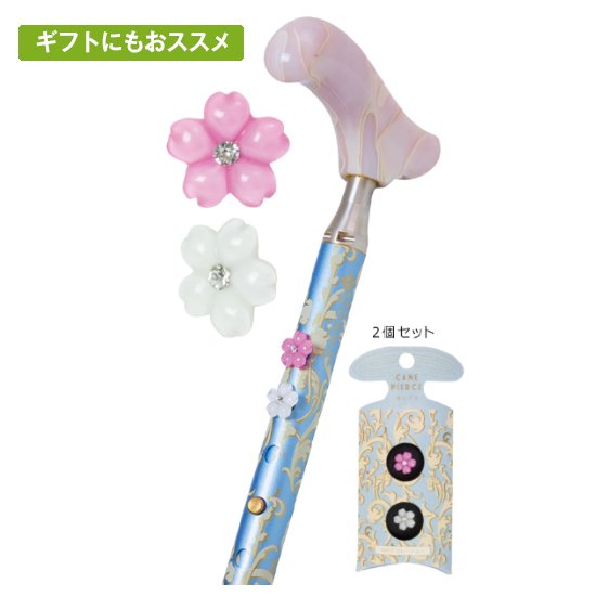桜をモチーフにした、可憐で優しいデザインの杖用アクセサリーです。折り畳み杖や、長さ調節杖の杖穴に挿してオリジナリティを演出します。そのままプレゼントできる、華やかなオリジナルパッケージ入り。