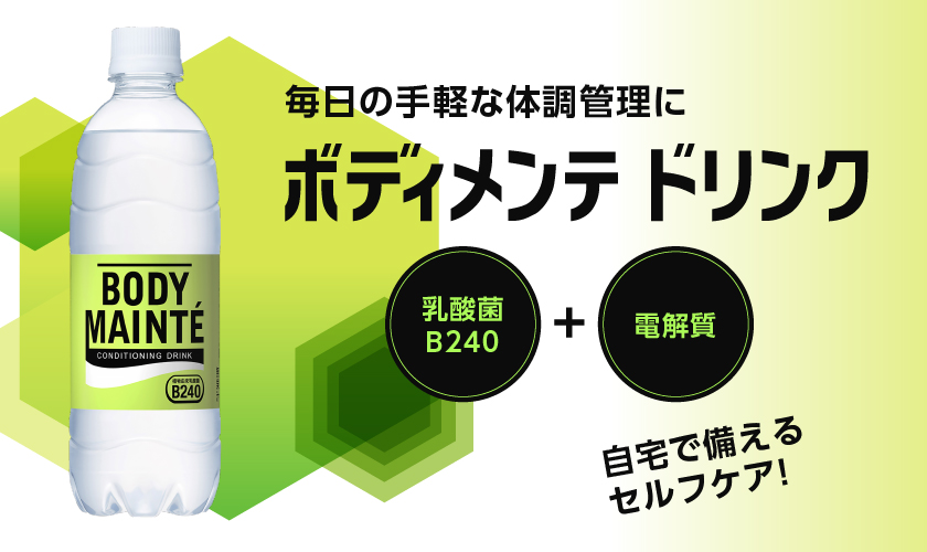| ボディメンテ・ドリンクは身体を守る「乳酸菌B240」と潤いをサポートする「水分・電解質」を組み合わせた、飲んでカラダをバリアする※新発想の飲料です。 様々な健康リスクにさらされる日常生活の中で、日ごろから体調管理を心がける人々のコンディションづくりをサポートします。 ※「バリアする」とは、コンディショニングに欠かせない成分が、いつもと変わらない体調と自分らしさを守ることです。 |
