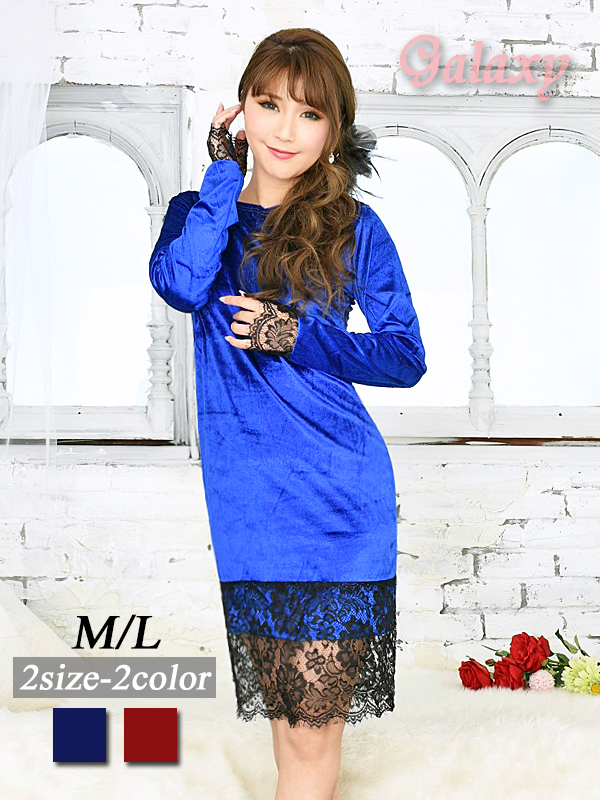 袖口&裾レース ベルベット調 ストレッチ 長袖 ミニワンピース キャバワンピ ナイトドレス ラウンジ パーティー 二次会 お呼ばれ 大きいサイズ