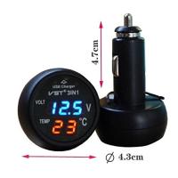 3in1デジタル電圧計温度計USBカーチャージャー 12V/24Vバッテリー対応