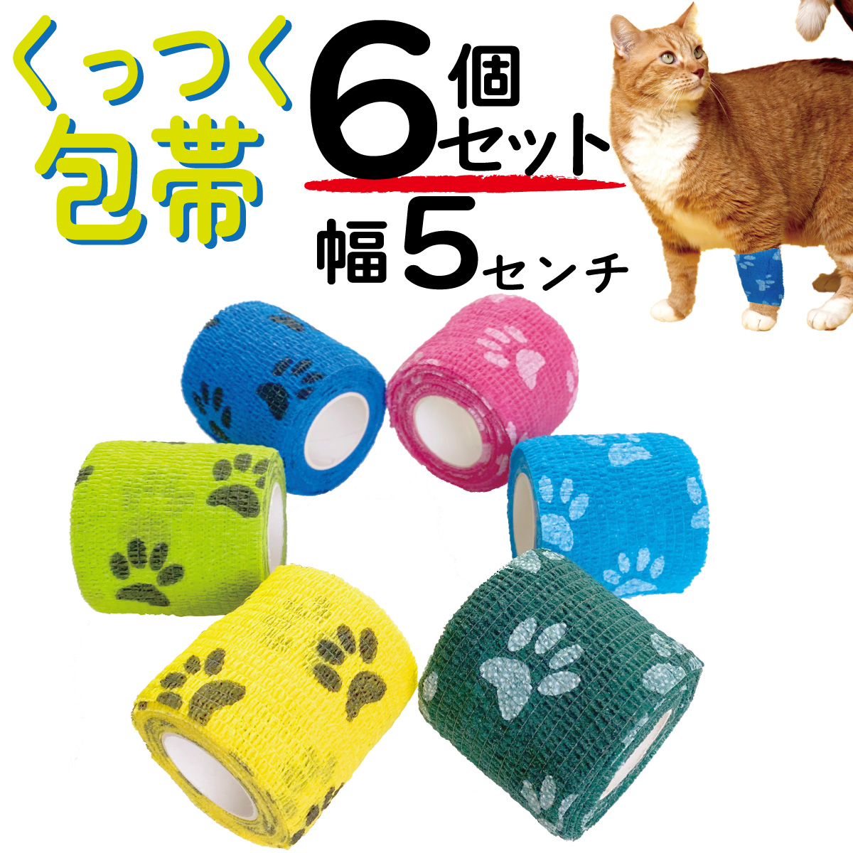 犬 包帯 猫 くっつく 幅5cm 手で切れる テーピング バンデージ ペット 自着性弾力包帯テープ 6巻 不織布 伸縮性 通気性 怪我 傷舐め防止 保護 伸縮包帯