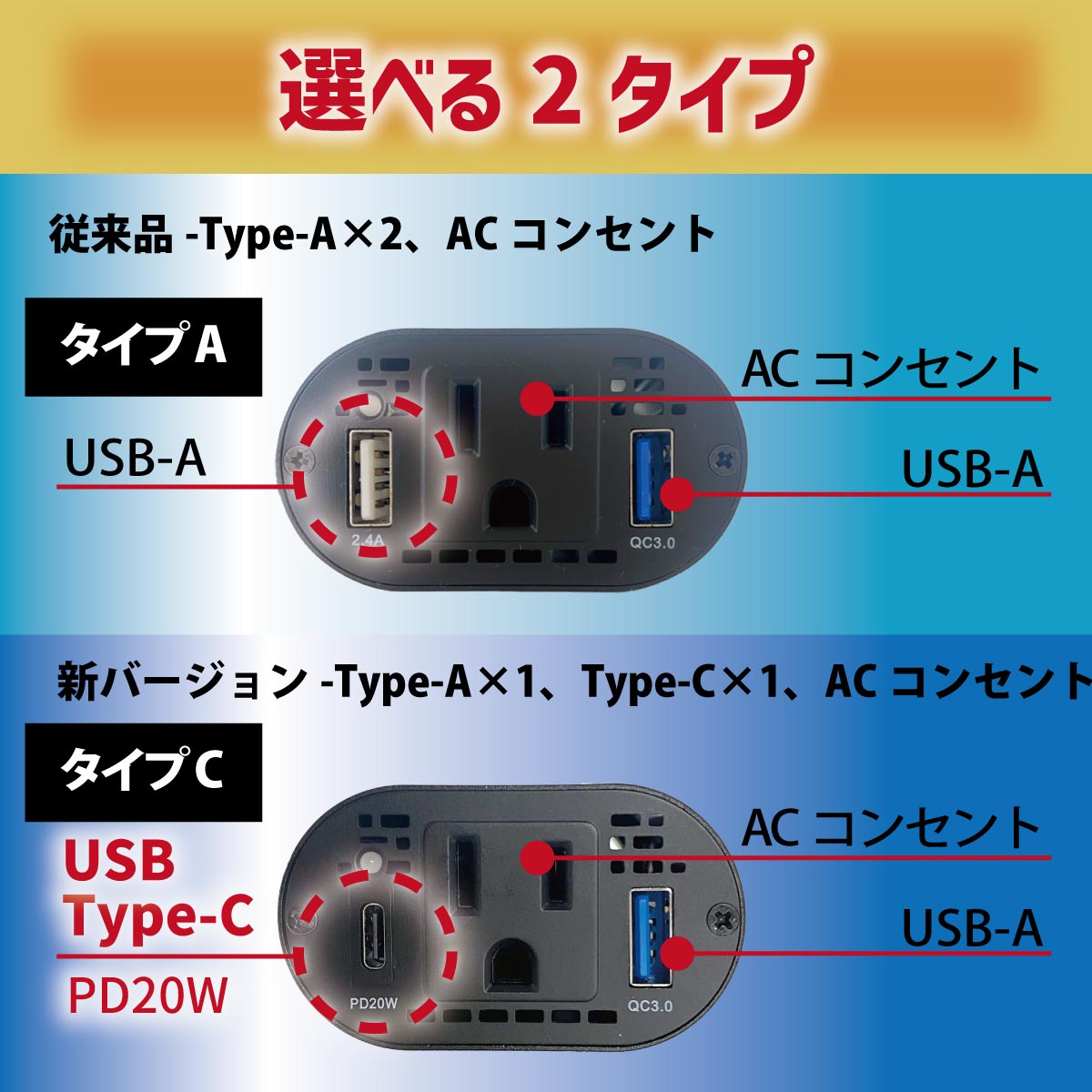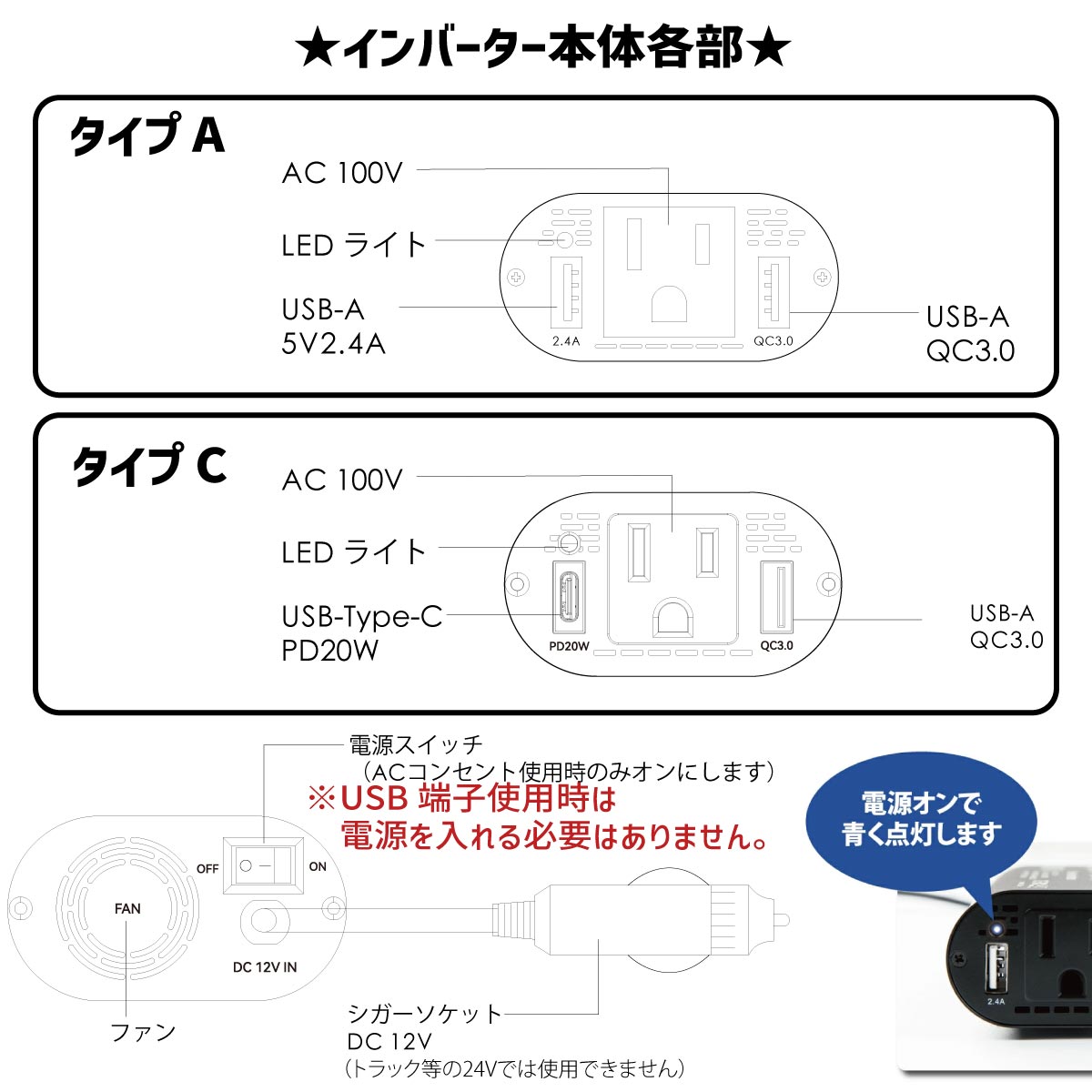 インバーター 12V 100V シガーソケット コンセント USBケーブル付属 150W QuickCharge3.0 急速充電器 PD急速充電 静音 カーチャージャー 車載充電器 USB Type-C