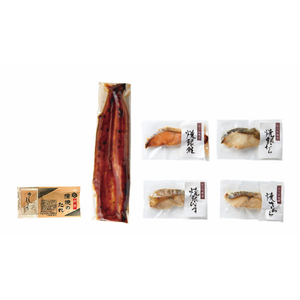| 焼銀鮭吟醸漬70g×4、焼銀ひらす吟醸漬70g×4、焼さわら吟醸漬70g×4、焼銀だら吟醸漬70g×4、うなぎ蒲焼100g(国産・長焼き)×6、蒲焼のたれ(山椒付)×6 ※「蒲焼のたれ(山椒付)」のパッケージデザインは変更になる可能性がございます。予めご了承くださいませ。 |