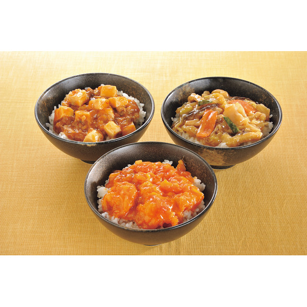 | 海老チリ丼の具90g×3、中華丼の具(醤油味)90g×3、麻婆豆腐丼の具90g×3 |