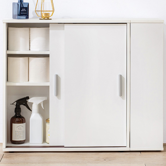 引き戸タイプなので省スペースなのに、大きめのペーパーロールも入る収納力。お掃除ブラシが収納できるサイドラック付き