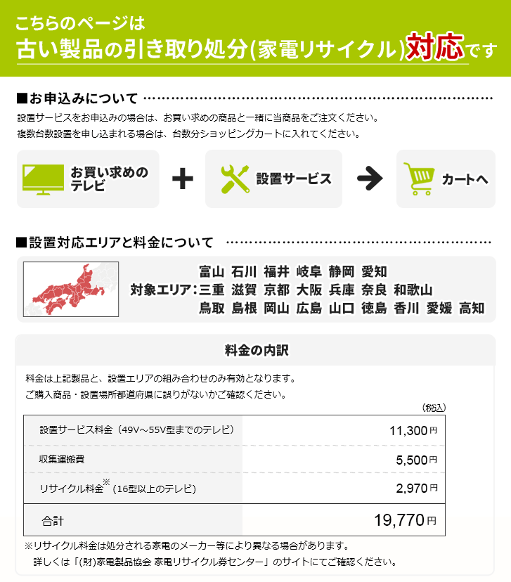 「49〜55V型の薄型テレビ」北陸中部近畿中国四国エリア用【標準設置+収集運搬料金+家電リサイクル券】16型以上の古いテレビの引き取りあり/代引き支払い不可