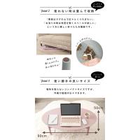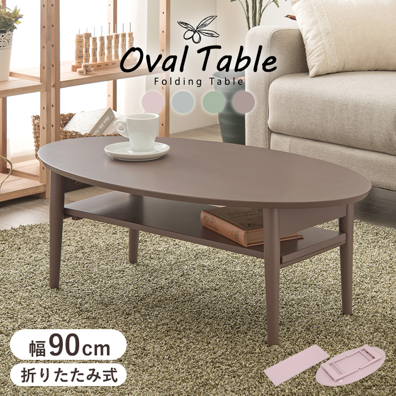 くすみカラーが可愛い折れ脚テーブル。雑誌などをサッと収納できる棚付き。角のないオーバルタイプ