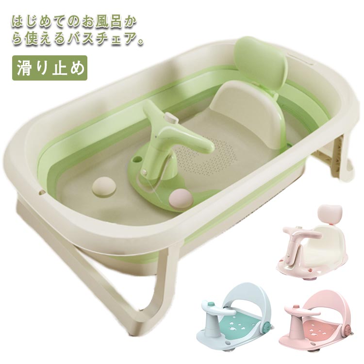 | はじめてのお風呂から使えるバスチェア。 4点の吸盤が付いている為、滑りにくい構造です。 安心して赤ちゃんをねかせて、ママの両手を使って洗うことができます。 ソフトバスマットがつめたい、かたいをやわらげます。 リクライニング3段階で、赤ちゃんの発達に合わせて変化します。 横から手が入り、洗いやすい形状です。 | |