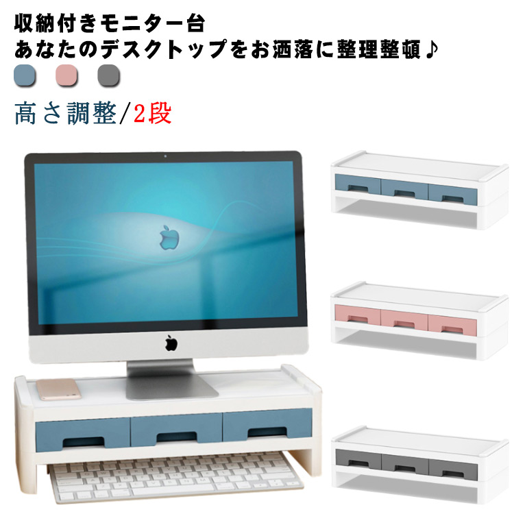 | 収納付きモニター台。あなたのデスクトップをお洒落に整理整頓? 高さ変更&収納付きで便利なモニター台。3つの引き出し付きで収納力抜群! 散らかりがちなデスク周りがスッキリ?収納スペースを作ってデスクが広く使える。 鉢植えなどの飾り物をつけば、特有の癒し空間を作れます。 キーボードやマウスをすっきり収納。作業スペースが広がります。 目線が上がって操作がしやすい。モニターを適切な高さにすれば、猫背を防ぎ、首や肩の負担を軽減することにつながります。 | |