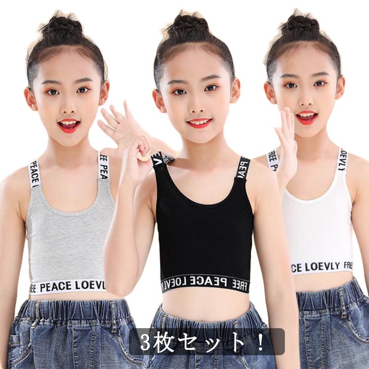 | 3枚セット! アンダー部分が可愛いロゴ入りゴムなのでずれることなく着用できます ダンスの発表会やダンスコンテストなど、チーム衣装としてや普段着にもおしゃれ! 安心のしっかり縫製、素肌に着る物だからこそのこだわり。 少し薄めで伸縮性があるので、インナーにも大活躍です。 | |