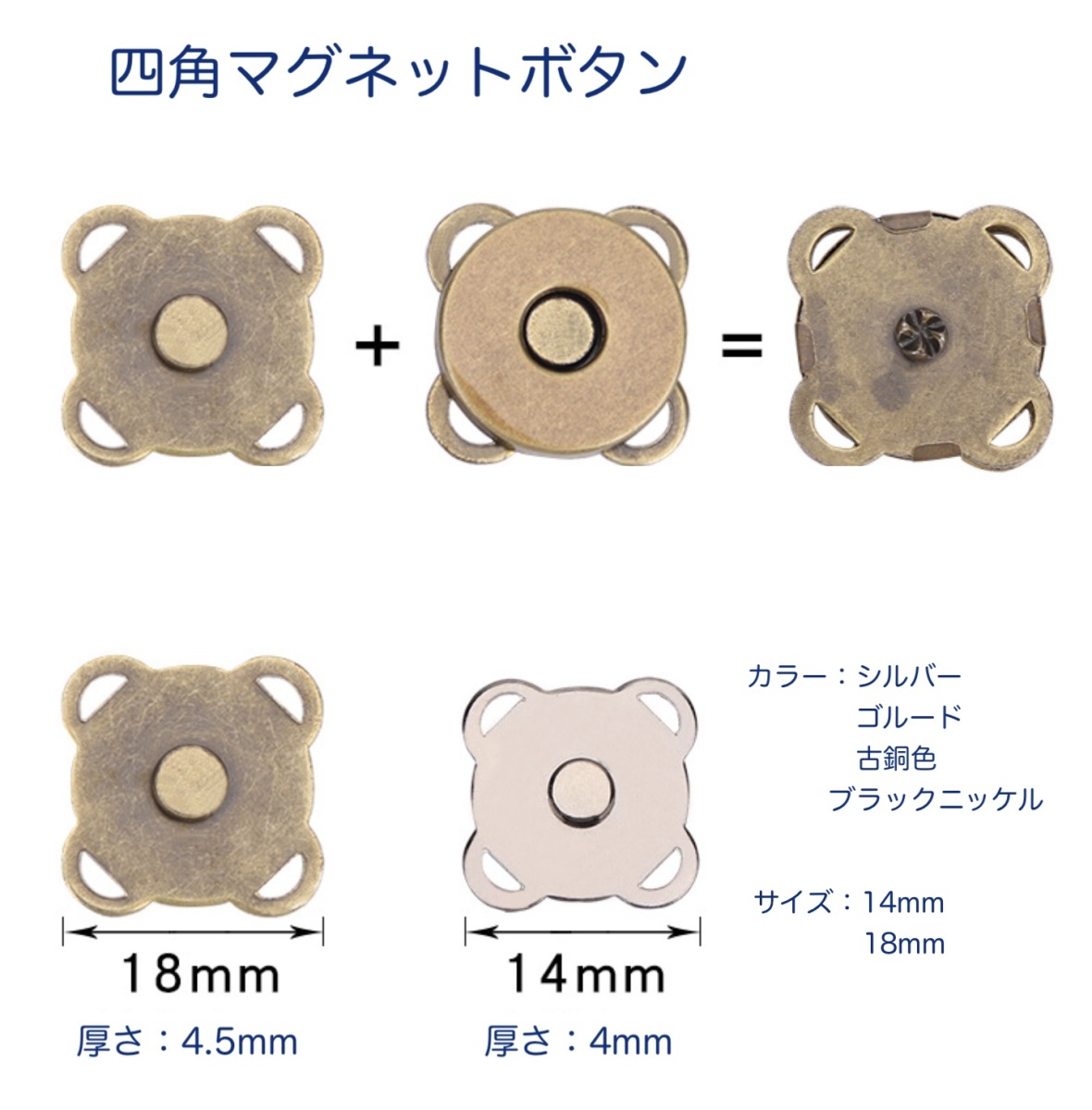 四角マグネットボタン 14mm 18mm 縫い付け ハンドメイド 手芸 手作り バッグ ポーチ ホック 磁石 「メール便OK」
