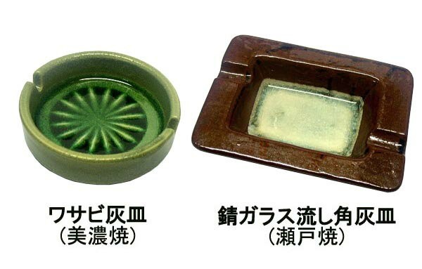 日本製 伝統焼き物 ワサビ灰皿(美濃焼) & 錆ガラス流し角灰皿(瀬戸焼) 2点セット