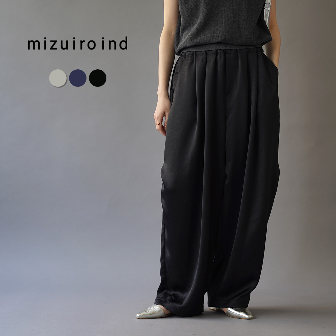 | ●スタッフ(158cm/49kg) 体型:普通 着用:サイズ2 フラットシューズと合わせて、裾がギリギリ床に付かないぐらいの長さで穿けました。写真のモデルに近いシルエットになります。一見ぽってりとした形のパンツですが、サテンの光沢とドレープ感で想像以上に上品に決まります。 |