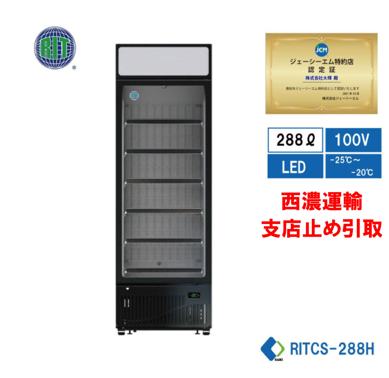 JCMCS-288H | 幅660×奥行714×高さ1956mm | 288L | 126kg | -25℃〜-20℃ |