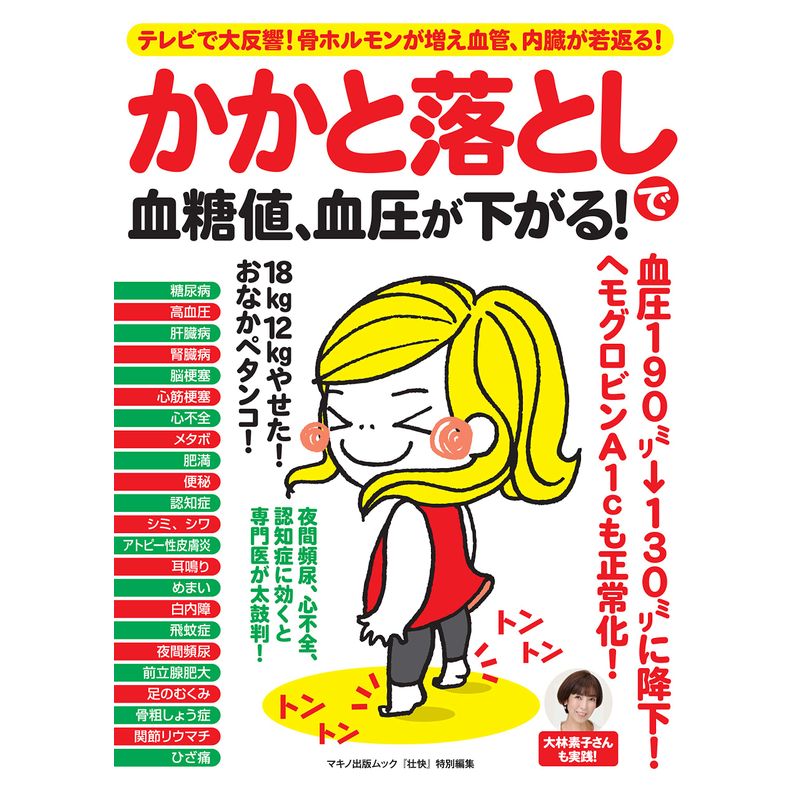 多くの専門医が太鼓判! かかと落としのココがすごい 「かかと落とし」はとても簡単な体操ですが、その健康効果は抜群。その健康効果は、 ?骨が強くなる ?骨ホルモンが増える ?血糖値の上昇を抑える ?血圧を下げる ?血管が若返り、ゴースト血管が生き返る ?記憶力を高め、認知症を防ぐ ?夜間頻尿、足のむくみを改善する ?簡単で体への負担も少ない などなど。最近の研究では、かかと落としが、全身の臓器を活性化する骨ホルモン(オステオカルシン)の分泌を促すことが判明。テレビでも度々取り上げられています。 骨への刺激が骨ホルモンの分泌を促す! 骨ホルモンは、唯一、骨芽細胞から分泌されます。古い骨を壊して新しい骨を作ろうと、骨芽細胞の働きが活発になったときに、骨ホルモンが分泌されやすくなるわけです。 骨ホルモンの分泌を増やすのに、いちばん効果があるのは、骨が外部からの刺激を感知するような運動をすることです。 こうした刺激(振動)が骨にも伝わると、骨の大部分を占める骨細胞から「骨を壊せ」という情報が破骨細胞に届きます。すると、破骨細胞が骨を溶かし、そこに骨芽細胞が集まり、骨ホルモンが分泌されます。 骨ホルモンの分泌が臓器の働きを活性化! 骨ホルモンの働きは、血糖のコントロールにとどまりません。その後の研究で、次のような臓器の働きも活性化させることがわかっています。 ●脳……神経細胞の結合を維持させて、認知・記憶機能を改善。 ●心臓・血管……動脈硬化を防いで、心筋梗塞などの血管性疾患を予防。 ●肝臓……肝細胞の代謝を上げて、肝機能を向上。 ●腎臓……骨で作られているFGF23というホルモンが腎機能を改善。 ●小腸……糖などの栄養吸収を促進。 ●精巣……男性ホルモンの分泌を増加させ、生殖能力を高める。 ●皮膚……皮膚組織と同じ種類のコラーゲンが骨で作られ、シワの改善に役立つ。