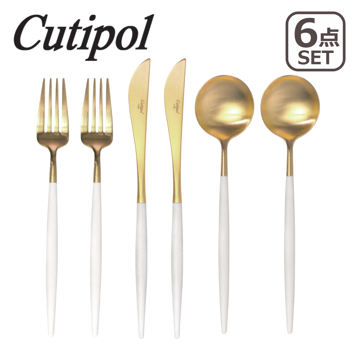 | 【 GOA(ゴア)】 人気の高い GOA(ゴア)シリーズは、マットな印象のカトラリー。人間工学に基づいたモダンなデザインは、スタイリッシュで とてもオシャレ。樹脂で出来ている柄が木製のような温かみをもち、サラリとした肌触りで手によく馴染みます。ステンレスのゴールド色にホワイトカラーが素敵なカトラリーは、食卓もスタイリッシュに演出してくれます。 通常使いに嬉しい!新生活にピッタリのディナー(ナイフ・フォーク・スプーン 各2本)の6点セット! |