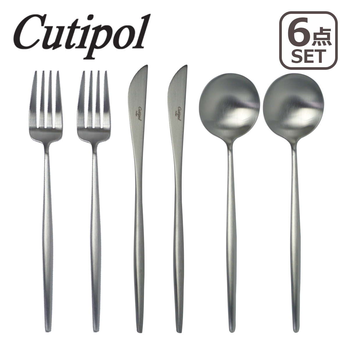 | 【 MOON MATT (ムーンマット)】 人気の高い GOA(ゴア)シリーズと同じラインのマットな印象のカトラリー。人間工学に基づいたモダンなデザインは、スタイリッシュでとてもオシャレ。女性の手にもしっくりと馴染むデザインは、持ち手部分もステンレス一体型になっており、満月のような丸みを持ったフォルムは繊細でいてとても上品な印象です。 ディナーナイフ、ディナーフォーク、ディナースプーンのディナー6点セット。普段使いから、おもてなしまで、幅広く使いやすいセットです。 |